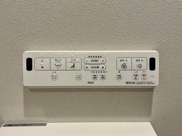 温水洗浄便座付きのトイレは、機能面も十分。装飾を抑えた設計のため、掃除がしやすく清潔な状態を保ちやすそうです。ちょっとしたカウンター付きで、スマートフォンや小物を置ける点も実用的。