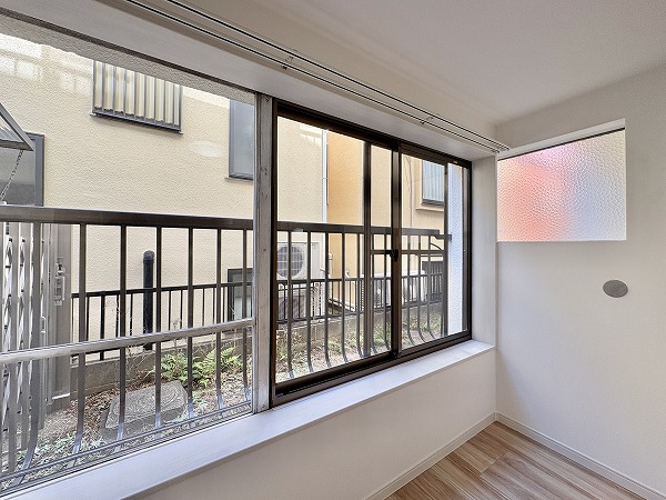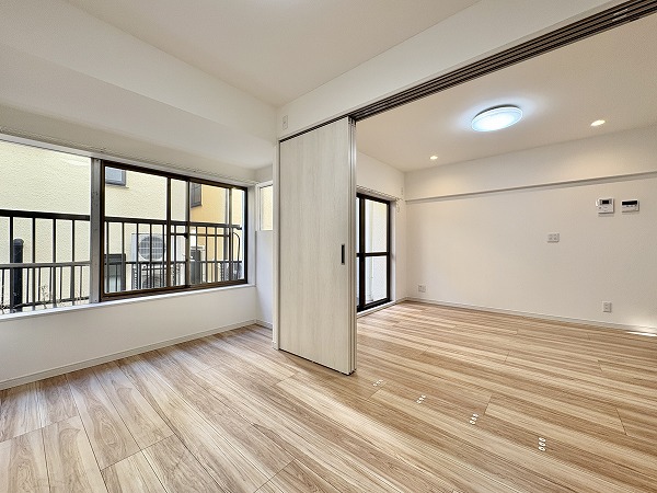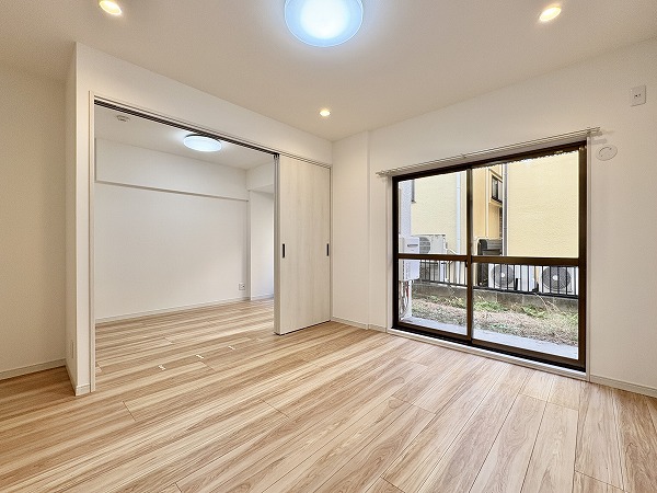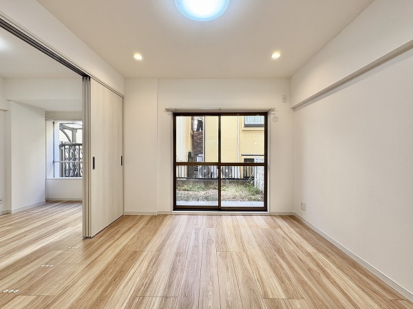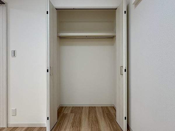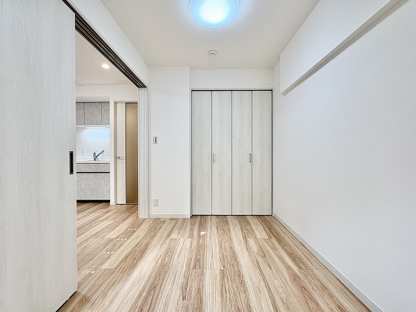 約4.4帖の洋室はスライドドアでメインルームと仕切られており、扉を開ければひと続きの空間として使用可能。ワイドな窓から光が差し込み、日中は照明いらずの明るさです。大容量のクローゼットを備えており、収納面でも安心感がありました。