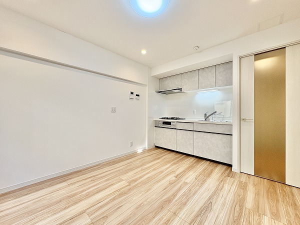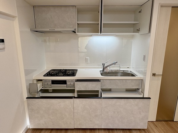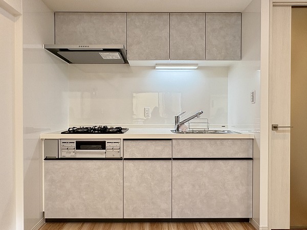 壁付仕様のキッチンは空間を有効活用しやすい設計。3口コンロ+グリル付きで、調理効率の良さが魅力です。作業スペースと収納のバランスも良く、自炊を前提とした生活をしっかりと支えてくれるキッチンと言えるでしょう。