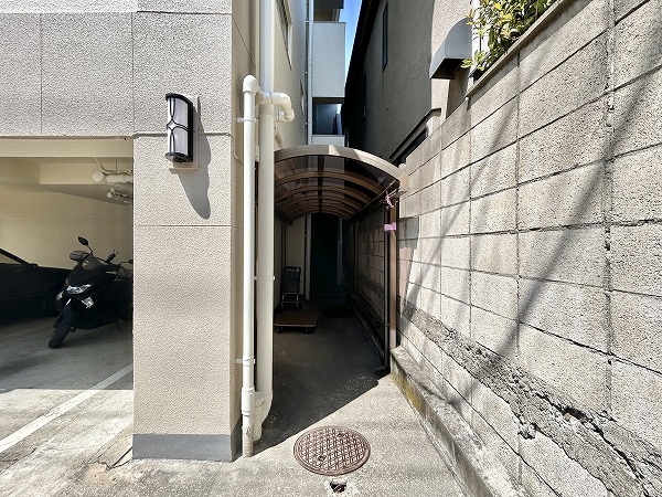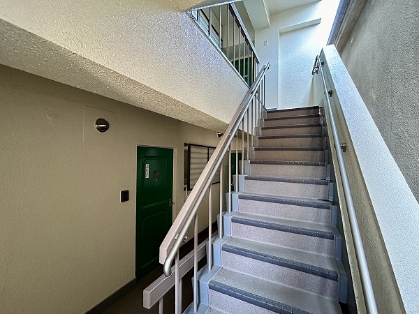 共用階段・廊下は、駐車場脇の通路を進んだ先に配置。各フロア2~3戸のみのため、共用部はコンパクトで静かな環境です。外廊下ながら周囲からの視線が届きにくく、住戸までの動線に安心感があります。