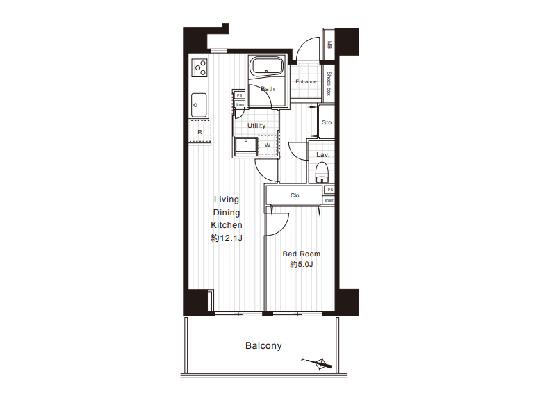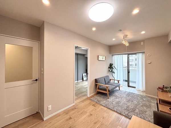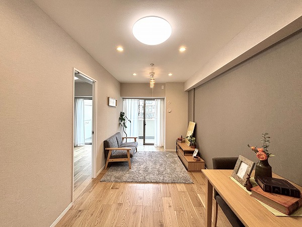 メインルームは約12帖。キッチンは入って右手、リビングダイニングは左手に配置されたレイアウトです。ひと続きの空間ですが、家具の配置や動線によって自然にエリア分けがされ、生活にメリハリを持たせられる設計です。