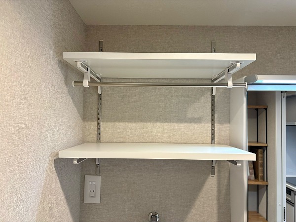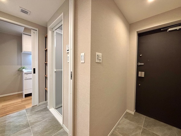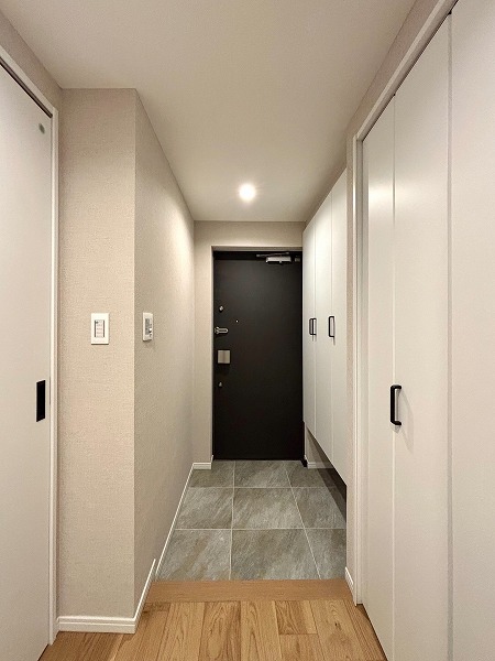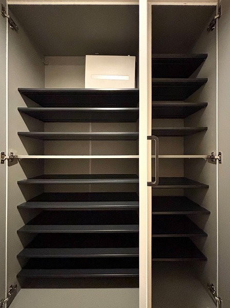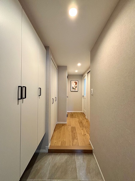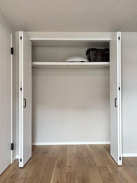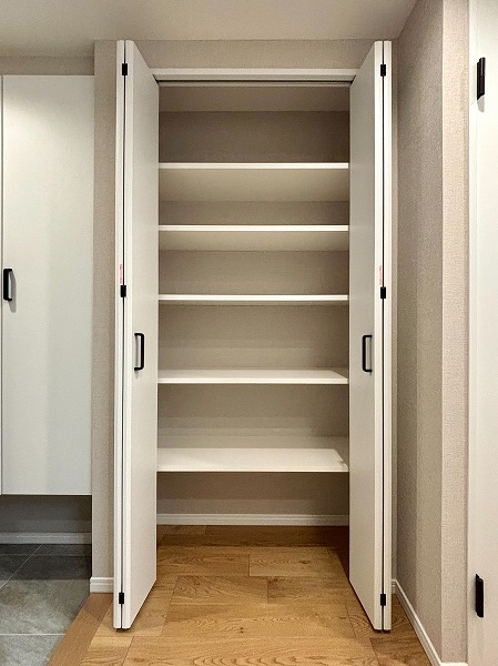 玄関収納も充実!大きなシューズクローゼットに加え両開き折れ戸の棚も備わっています。ペット用品や掃除用具、日用品のストックなどを効率的にすっきりと整理整頓可能◎