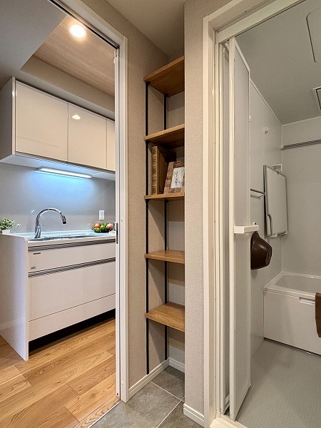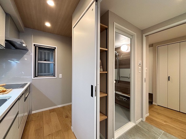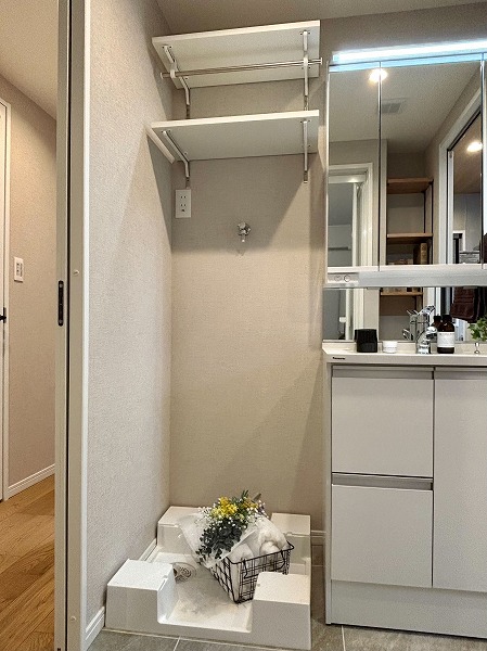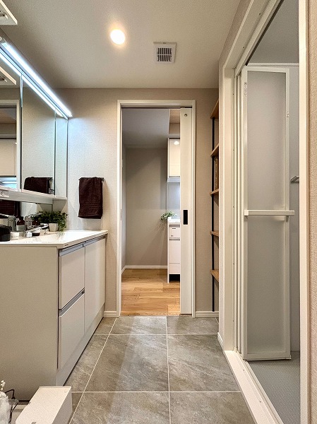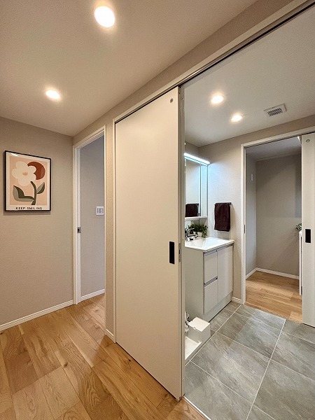パウダールームは、玄関ホールからキッチンまで直接抜けられる回廊型の設計を採用。このレイアウトにより、家事の動線が効率的になっており、掃除や洗濯、料理などの日々の作業をスムーズに行うことが可能です。また、玄関からキッチンまで行き来がしやすいため、買い物帰りの荷物の運搬や、家事の合間の移動もストレスなくこなせます。