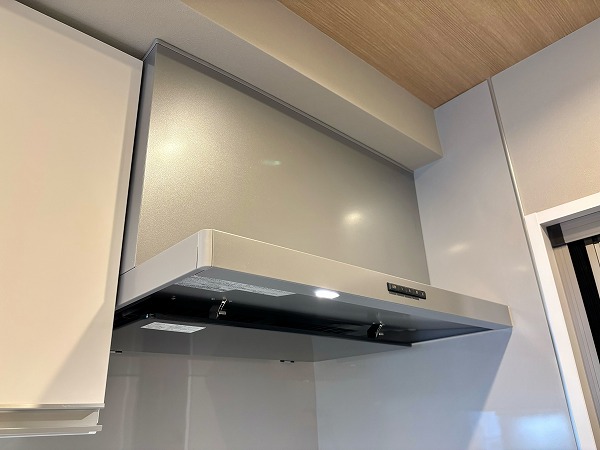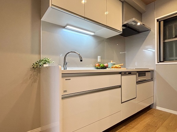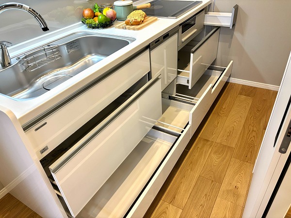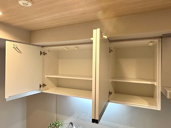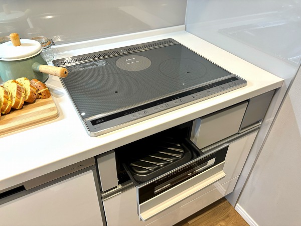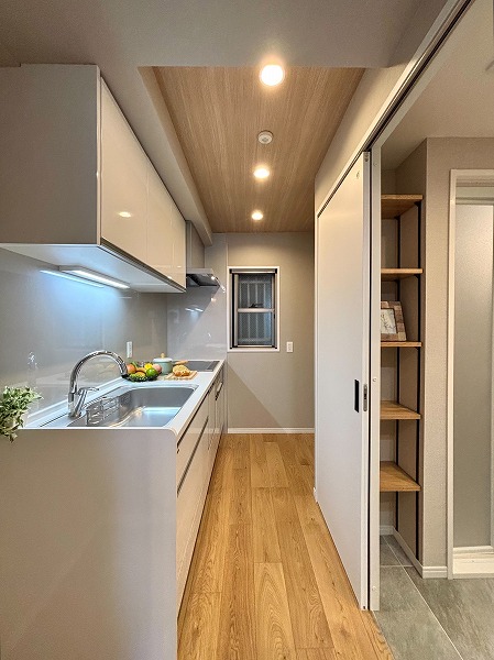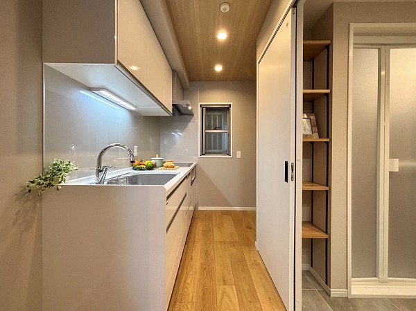 料理に集中しやすい壁付けキッチンは、天井の木目が温かみを演出。IHコンロを採用しており調理後の掃除が楽々。吊戸棚は少し低めの位置に設置されており、女性でも無理なく手が届き、毎日の調理や片付けが快適に行えますよ♪