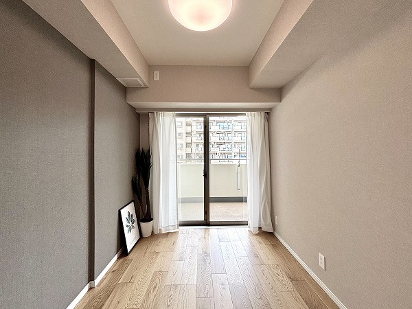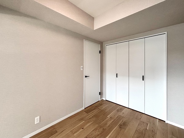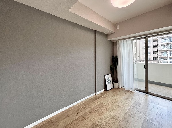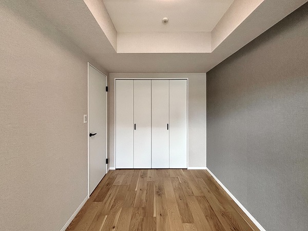 洋室は約5帖で、メインルームからアクセス可能。広めのクローゼットを完備しており、収納力も十分です◎メインルームと同じグレーのアクセントクロスが採用され、室内全体に統一感があります。