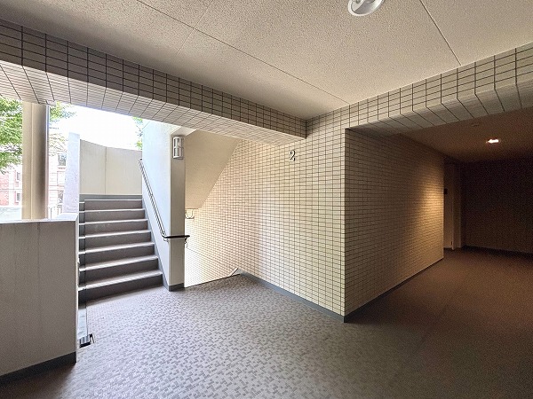 オートロックを抜けると、開放的なロビーが広がっています。ソファやテーブルが置かれた休憩スペースもあり、来訪者や居住者がちょっとした時間を過ごすのにも快適な空間です。