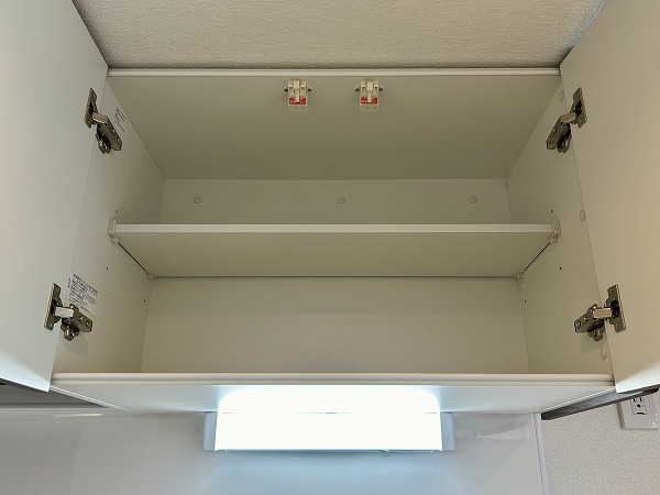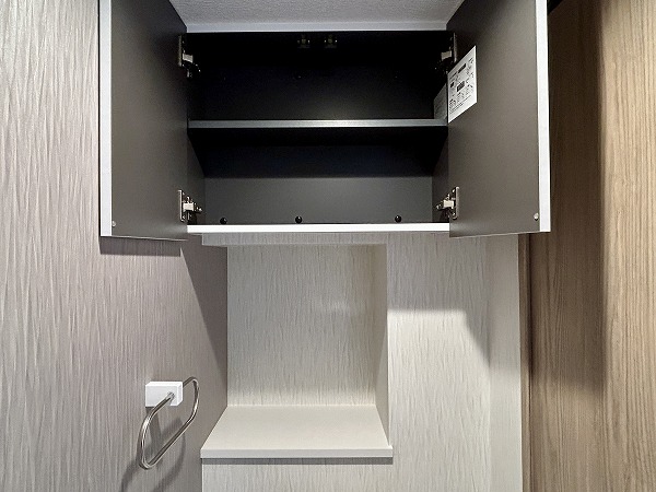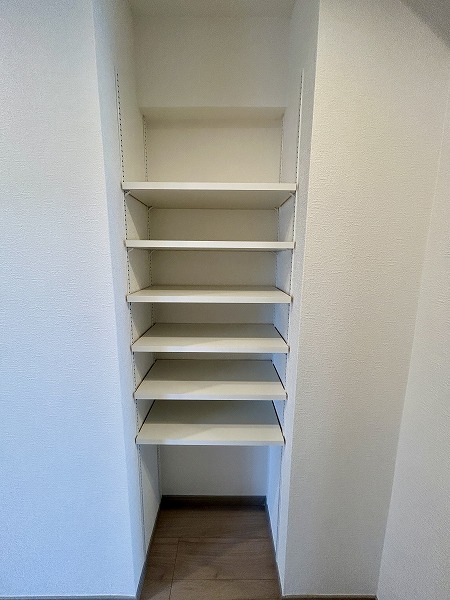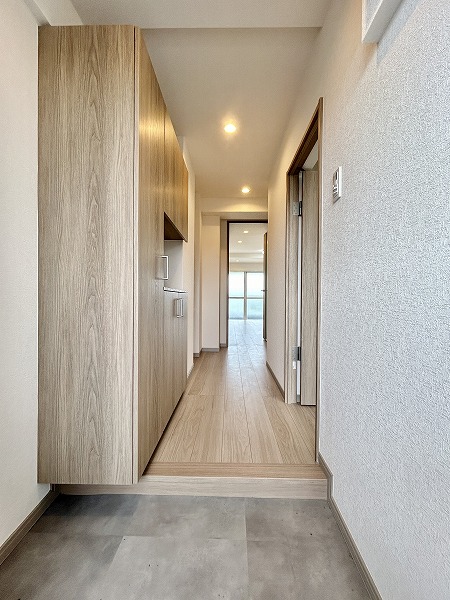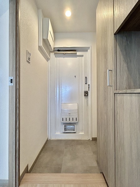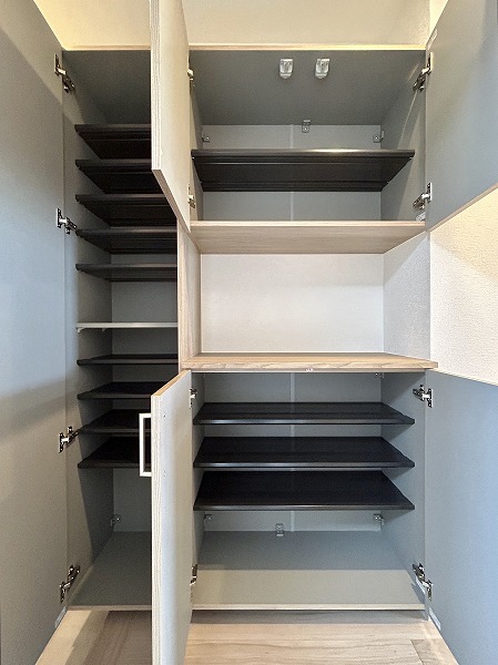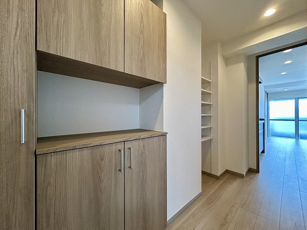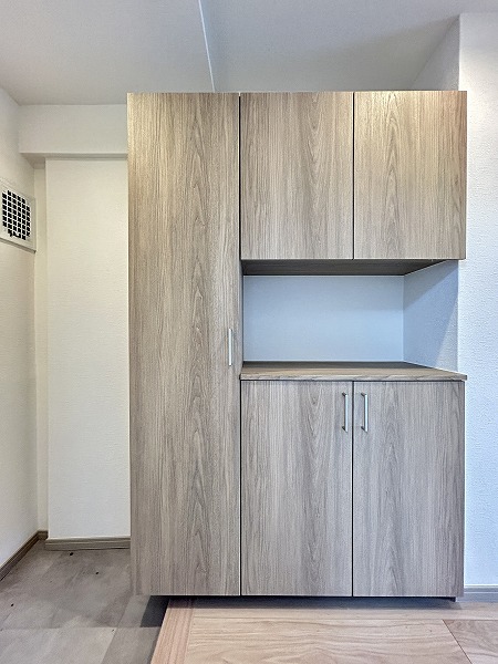 新設された玄関収納は、縦長タイプと分割タイプを組み合わせた便利設計。中央のカウンターには鍵や消毒液を置け、隣のスペースは傘立てとして活用可能です。