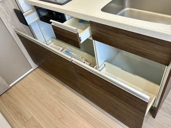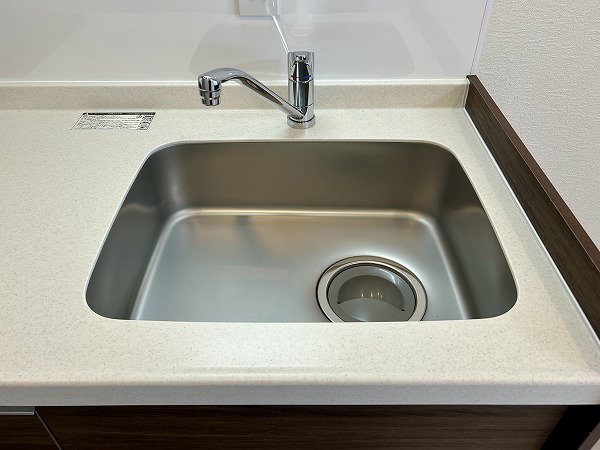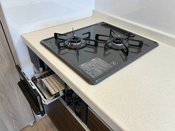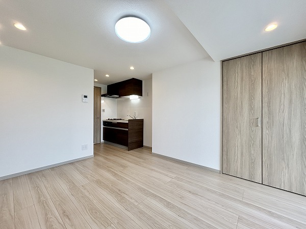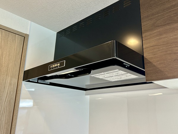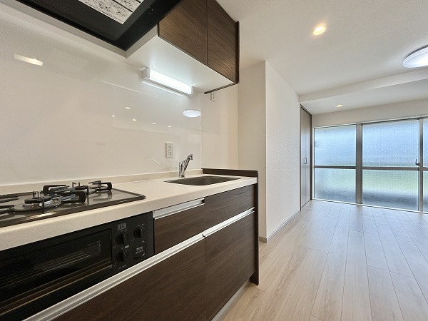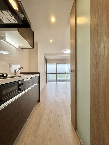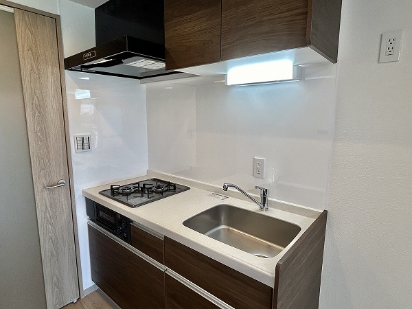 メインルーム入口に設けられたコンパクトな壁付けキッチン。必要なものがすぐ手に届く配置で、調理効率も抜群です。お掃除のしやすいスリムタイプのレンジフードで、日々の手入れもストレスフリー♪