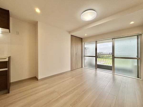 約8.9帖のリビングダイニングキッチンは、シングルの方向けの使いやすい設計。ここをメインのくつろぎスペース兼寝室として活用し、玄関側の洋室は荷物置き場として利用するのも便利です。窓の外には河川敷の緑が広がり、毎日の生活に爽やかな空気感を添えてくれます✿