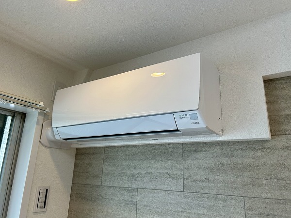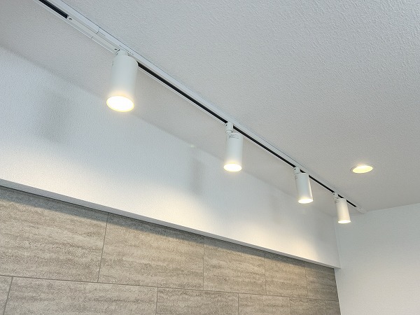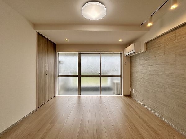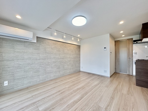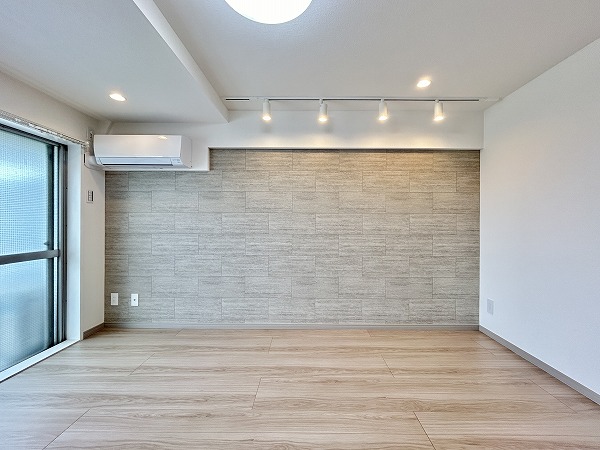 メインルームには石タイル風のアクセントウォールを採用。天井のライティングレールで照明を自由に調整でき、シンプルな空間でも華やかな印象を演出できます。エアコンも設置済みなので、すぐに快適な生活がスタート可能です◎