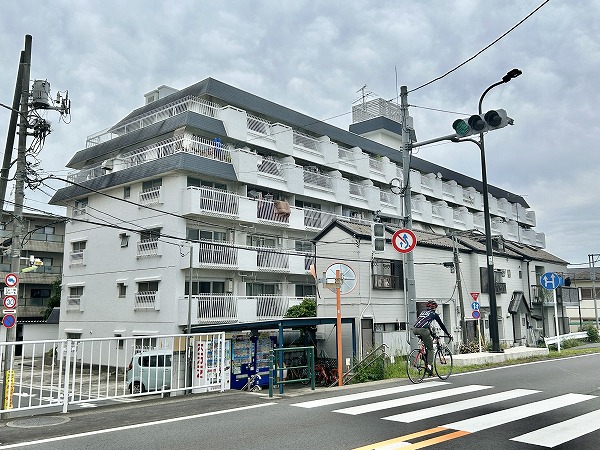 『田園フラワーホーム』は、多摩川沿いに悠然と建つヴィンテージマンション。白い外壁と深いネイビーの屋根が爽やかな印象✿鉄筋コンクリート造6階建て・総戸数75戸のスケールを誇り、リバーサイドならではの開放感を感じさせる佇まいとなっています。