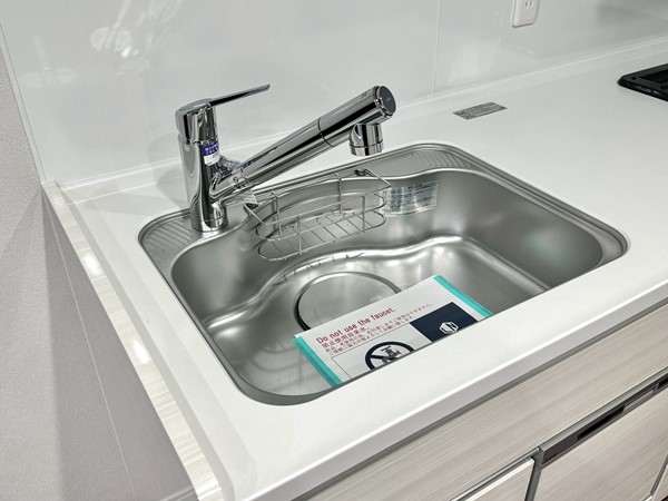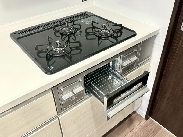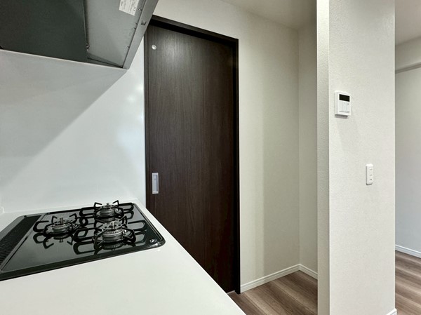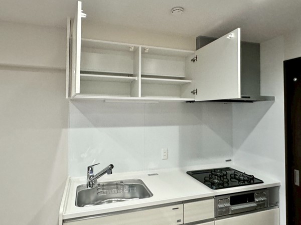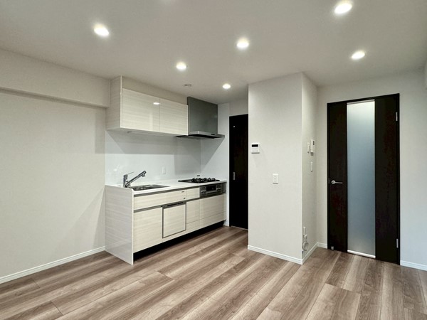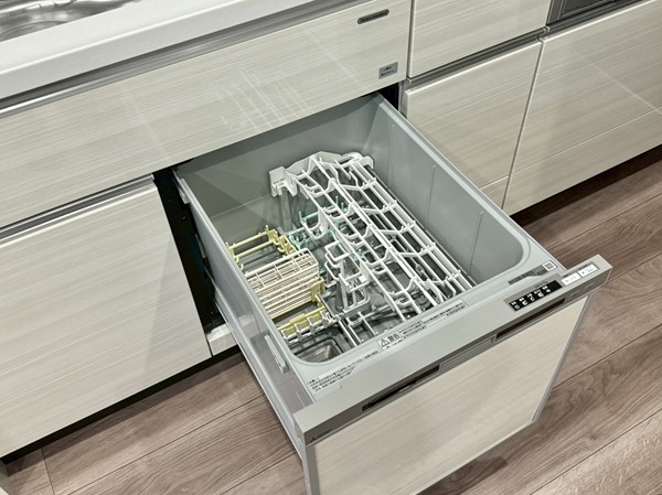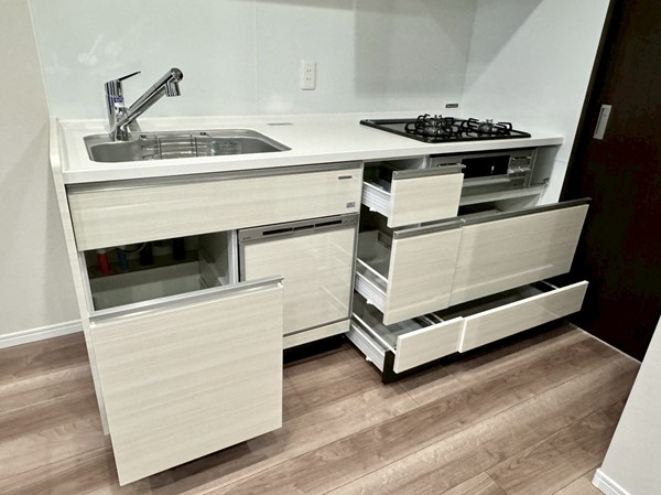 料理に集中しやすい壁付けのキッチン。お部屋のクロスと近い色合いが採用され空間によく溶け込んでいます。自動食洗機が内蔵されているので洗い物の負担を軽減できるのも嬉しいポイント♪
