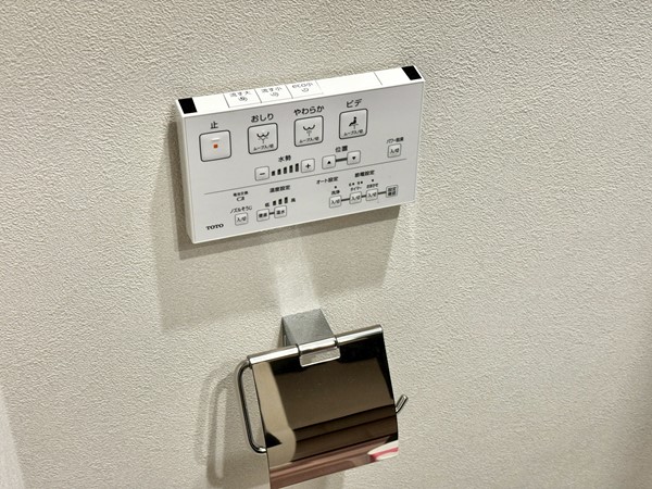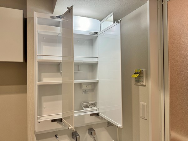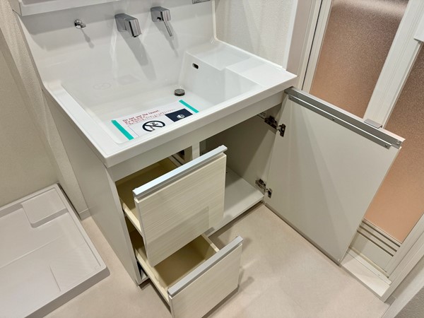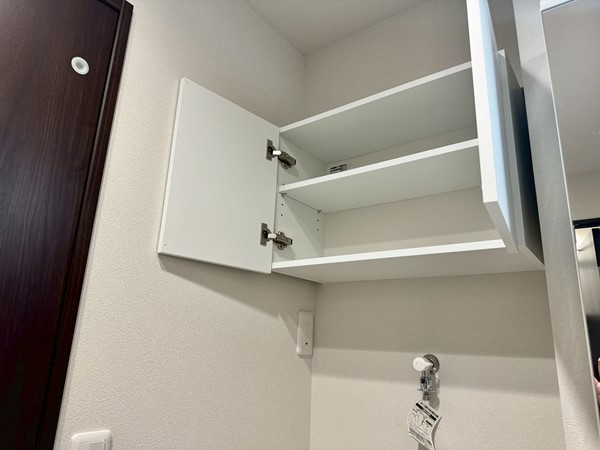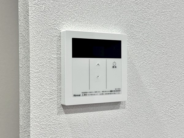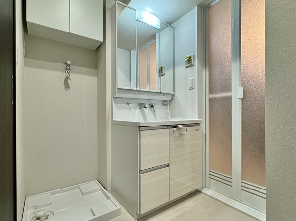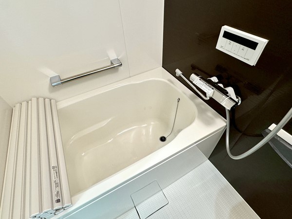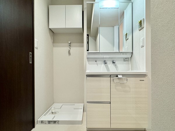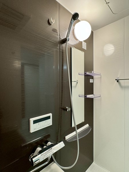 バスルームにも室内ドアと同じようなダークブラウンのアクセントパネルが取り入れられ、全体的に統一感のある内装デザインに。浴室乾燥機が取り入れられ、雨が続く季節の室内干しにも活躍してくれそうです。