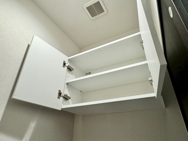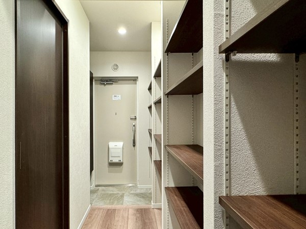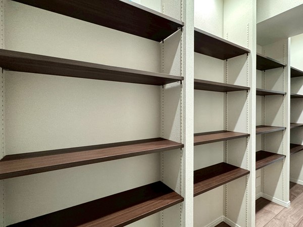 玄関収納に加え、廊下には壁一面にずらっとオープンシェルフが備え付けられていました。これだけスペースがあれば、日用品やストック類、防災用品、書籍など、様々なものをスッキリと収納しておくことが出来そうですね。