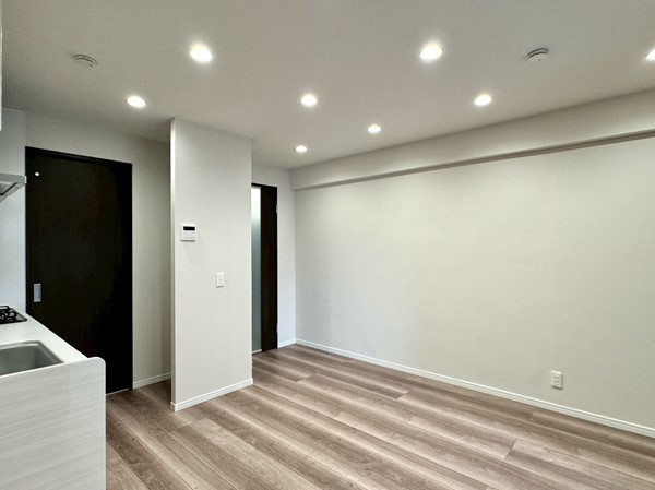 2025年9月に内装リノベーション済みの1LDK。ちょっぴりレトロな外観とは打って変わってモダンな空間へと生まれ変わりました。温かみのあるアイボリーの壁紙とダークブラウンの室内ドアのコントラストが印象的ですね。