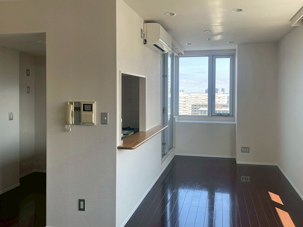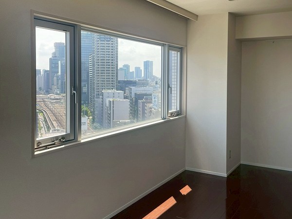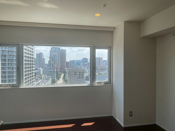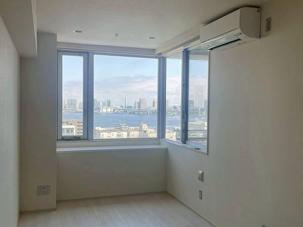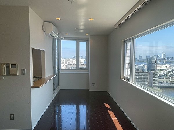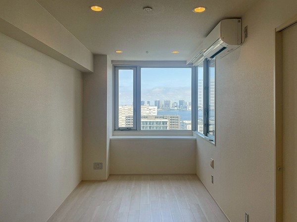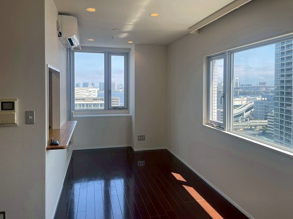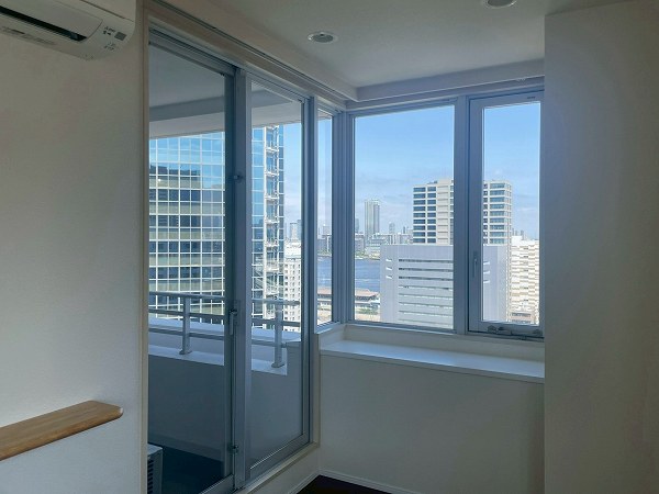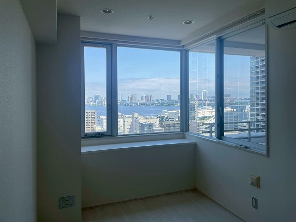 今回ご紹介するのは19階の1LDK、専有面積55.4㎡。2025年7月にリノベーションされ、清潔感のある状態が保たれています。メインのリビングダイニングは約14.2帖で、2面に大きな窓が設けられ、青空や東京湾、レインボーブリッジのパノラマが目の前に広がります。ソファに座ったまま景色を楽しめる開放感は、湾岸エリアならではの贅沢。バルコニーを中心にしたレイアウトで、リビングも洋室も光をたっぷり取り込み、外の空気を身近に感じながらお過ごしいただけます。