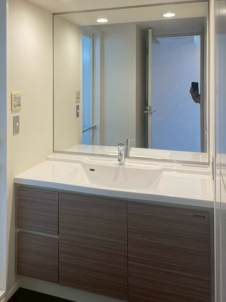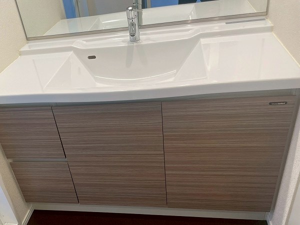 シンプルな1面鏡タイプの洗面化粧台。視界を遮るものが少ないため、洗面スペース全体がすっきりと広く感じられます。洗面下には収納も用意されており、日常使いのアイテムをまとめてしまえますよ。収納アイテムを取り入れるとよりスッキリ保てるのではないでしょうか。