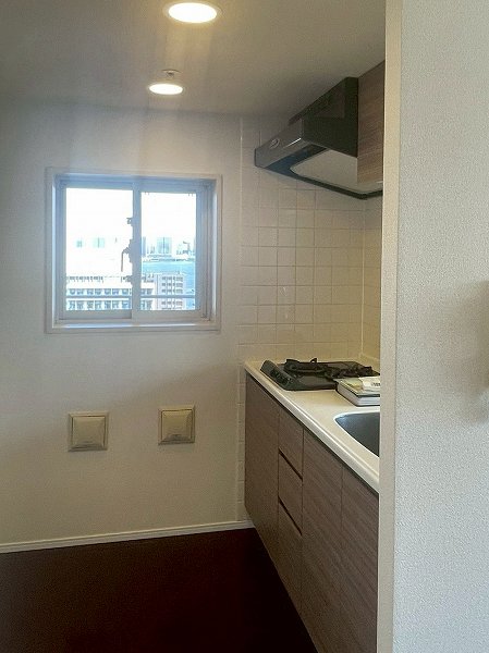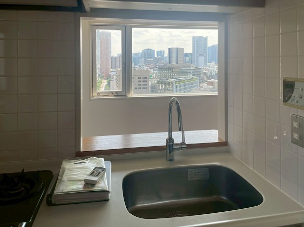 キッチンは約2.4帖の広さ。独立性を感じる配置ながら、シンク側がリビングダイニングに向けて開かれているため、空間のつながりを感じながら調理ができます。閉塞感が出にくいのも嬉しいポイントですね。