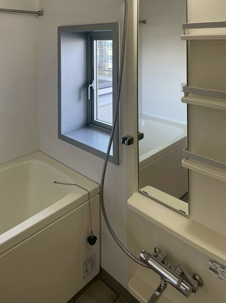 浴室は白で統一され、清潔感と開放感を感じられるシンプルデザイン。小窓が備わっているため、光と風を取り込みやすく、換気もスムーズ。窓際に小さなグリーンやアロマを置けば、さらに居心地の良いリラックス空間になりそうです✿