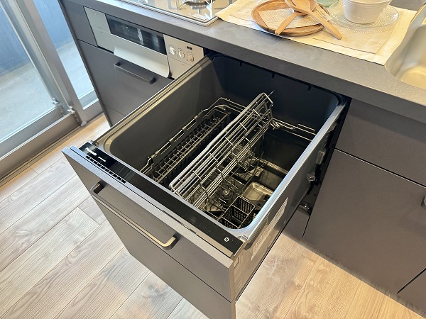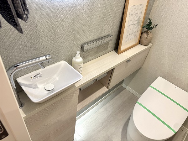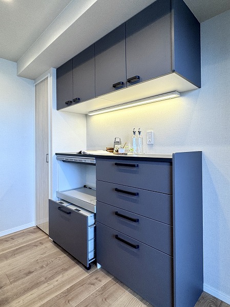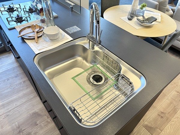 キッチンはリビング全体を見渡せるオープンタイプ。料理をしながら家族と会話をしたりペットの様子を見守ったりと、日々のコミュニケーションが自然と生まれる嬉しい設計です。背面には大きなカップボードを設置しており、食器や調理家電をたっぷり収納可能。炊飯器や電子レンジがすっきり置けるスペースもあり、家事のしやすさもしっかり考えられています◎