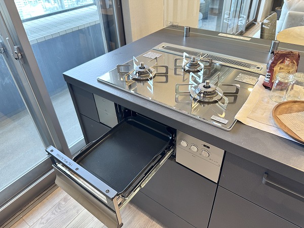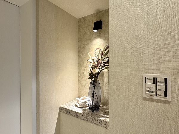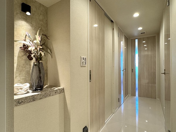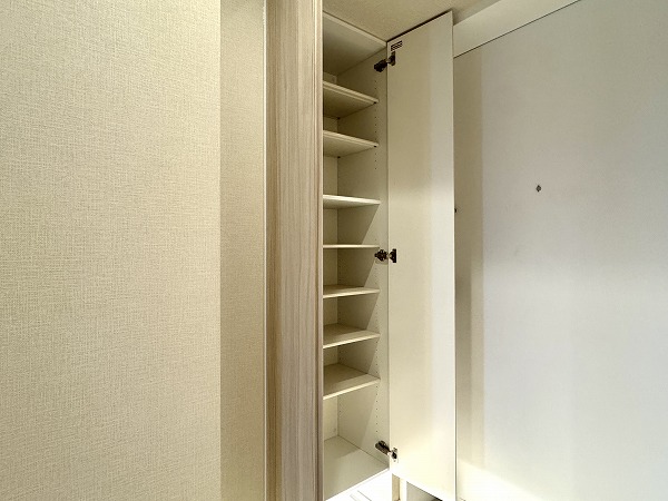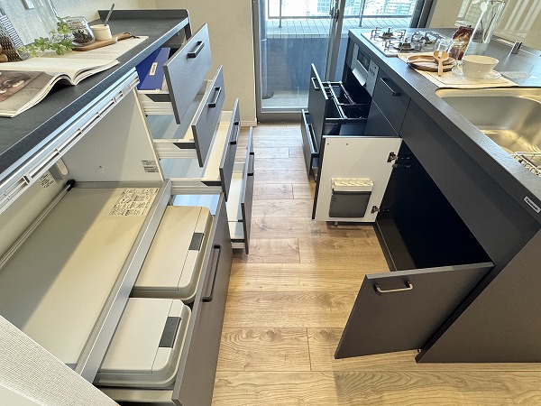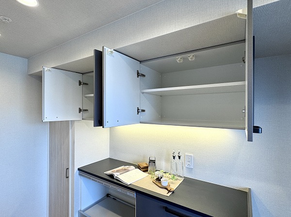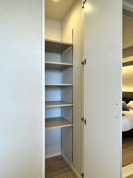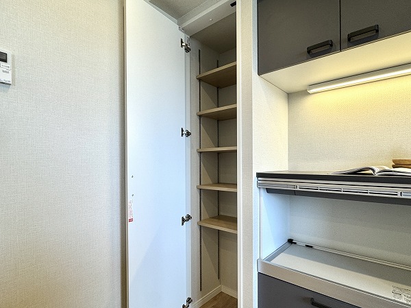 約6.1帖の洋室に取り入れられた大きなクローゼットに加え、廊下にはマルチウォークインクローゼットが完備され生活感を自然にしまい込める設計になっている点もおすすめしたいポイント。キッチン周りにも豊富な収納が備えられ、各所にバランスよく収納が設けられていました。