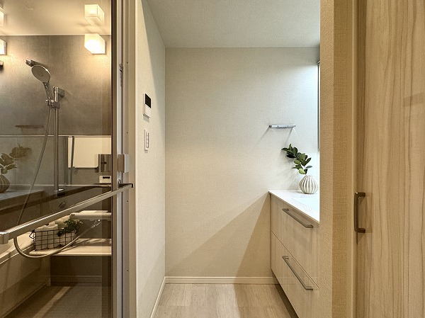 ブラウンの艶やかなキャビネットが印象的な洗面スペースには、贅沢なダブルボウルを採用。朝の忙しい時間にゆとりをもたらし、ホテルライクな暮らし心地を叶えてくれます。収納力も申し分なく生活感を上品に隠しながら使えるので、毎日をスタイリッシュに過ごしたい方にも最適です。