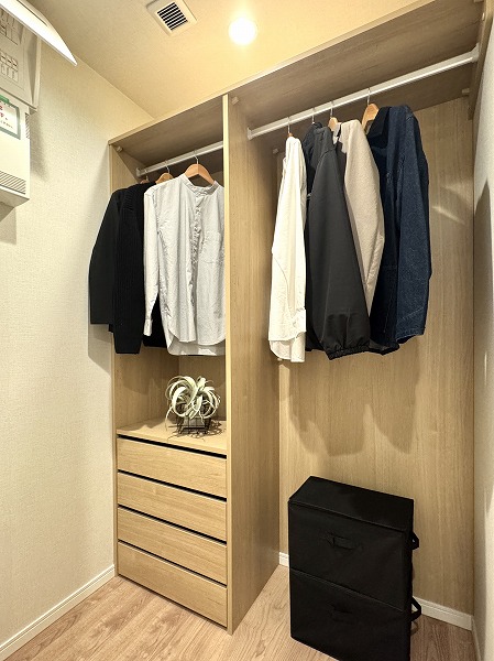 約3.9帖の洋室には壁1面にオープンクローゼットを設置。ハンガーパイプから引き出し収納まで完備しているため衣類や小物を整理しやすく、見せる収納として楽しむことも可能。空間を効率よく使えるため、書斎や趣味部屋としても活用できそうです。