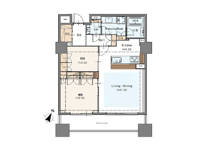 専有面積77.63㎡、11階部分の南西角住戸。アウトフレーム工法によって室内はすっきりとした印象で、インテリアの自由度が高い点が魅力♥お気に入りの家具やアートを配置しても空間に余白が残り、住む人のセンスが自然と映える一室に仕上がっていますよ✧