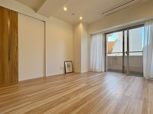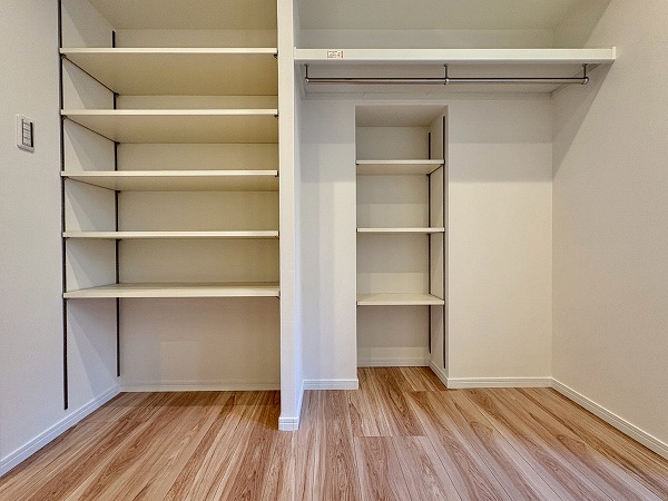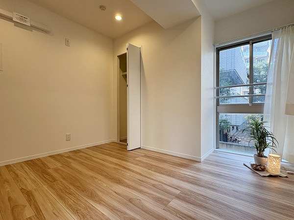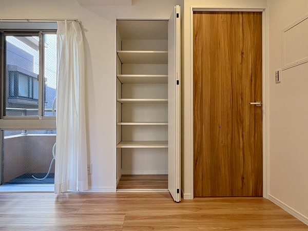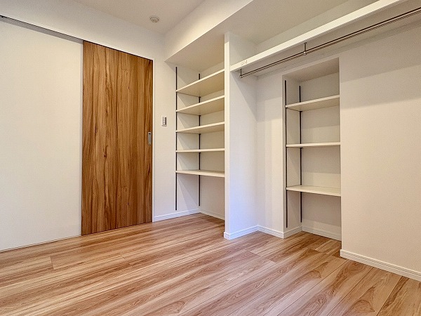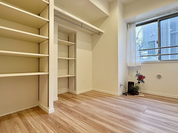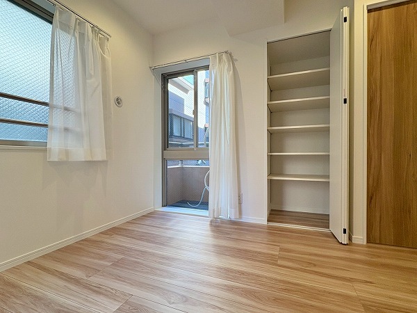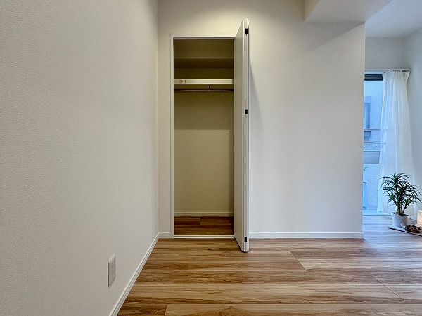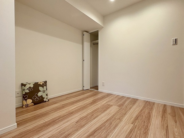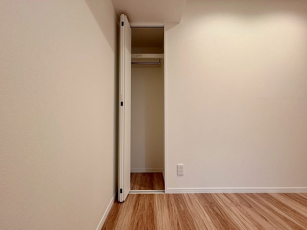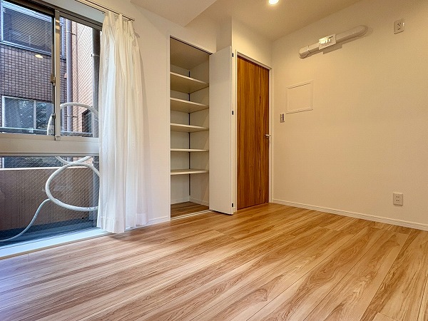 こちらは北西向き、約4.5帖の洋室です。壁に収納、オープンクローゼットが設置されているため、部屋に合う色味・サイズの棚を探す必要もありません!収納が固定の位置にあると、家具の配置も自然と定まってくるので、お部屋のコーディネートは楽ちんです!