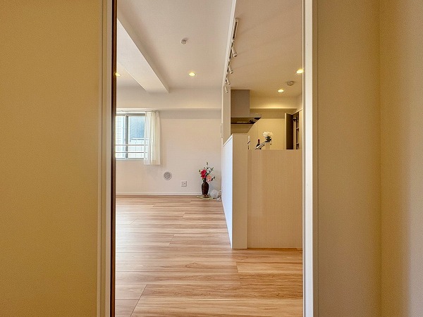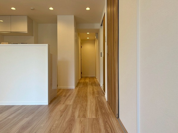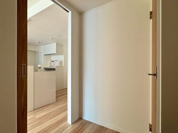 LDKから寝室・納戸にかけて廊下が伸びています。廊下にリビングからの光が差し込むので、日中はそれぞれの個室の戸を開けて、各部屋を自然光で照らすことも可能です!ペットの飼育がOKなので、ワンちゃん猫ちゃんがこの廊下を走り回る姿も想像できます...。