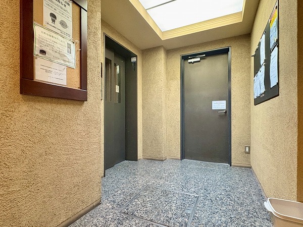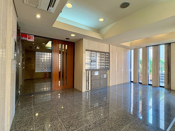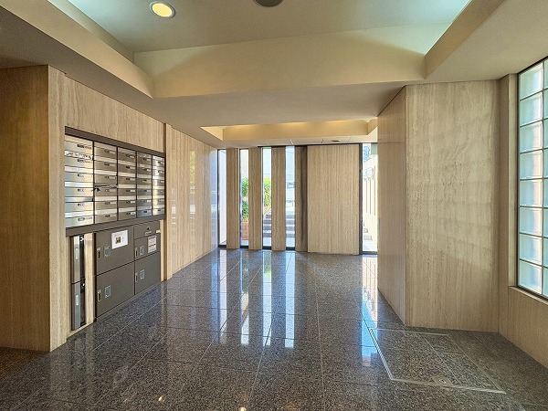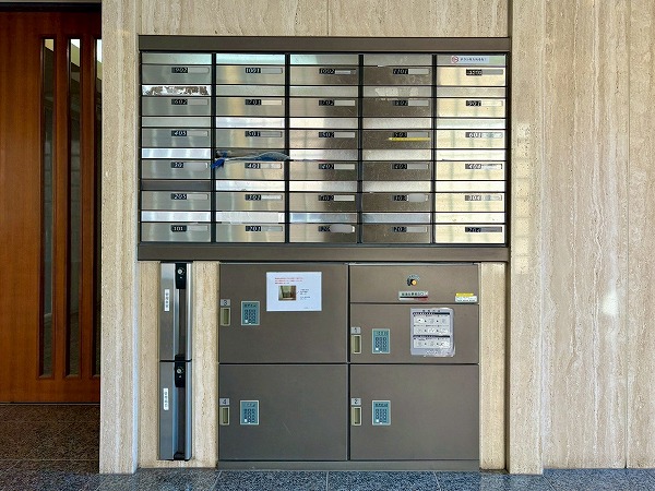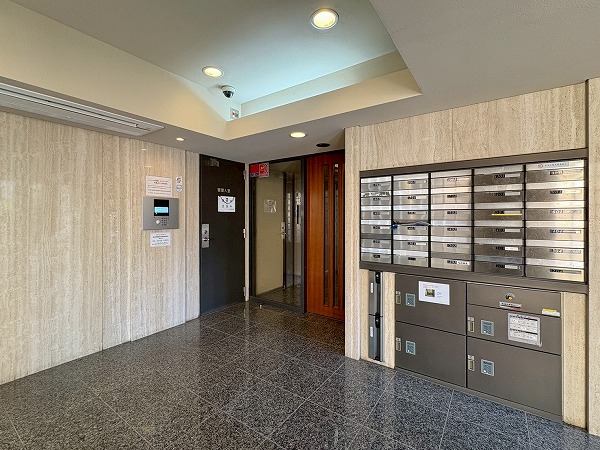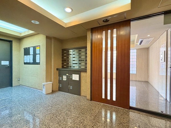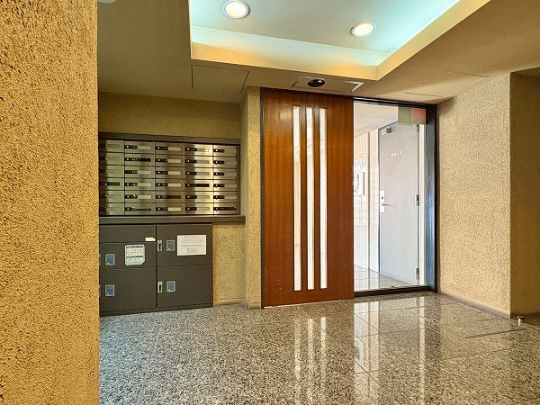 こちらがエントランスホールです。カギはオートロック式で管理人室、防犯カメラも設置されているため、セキュリティに隙がありません!便利な宅配ボックス付きで不在時も安心。ホール内にはエアコンが完備されているので、快適に出入室できます◎