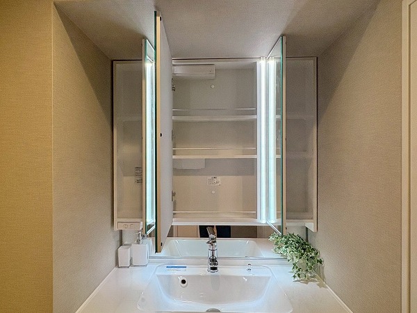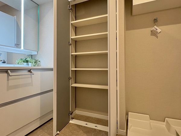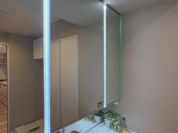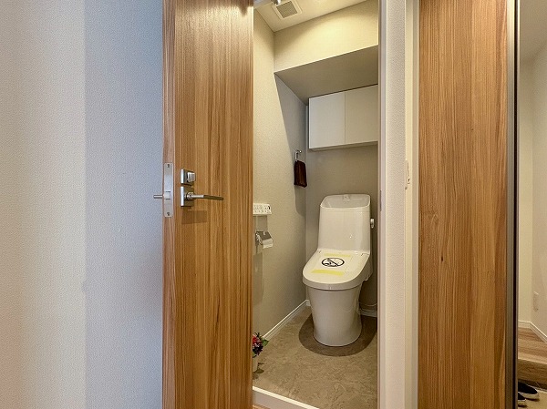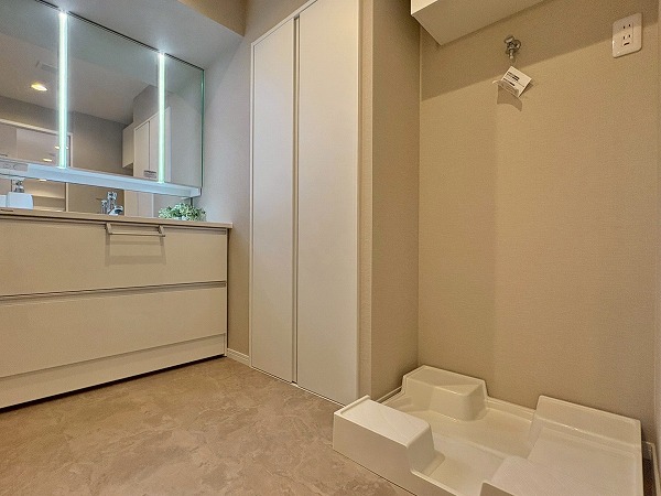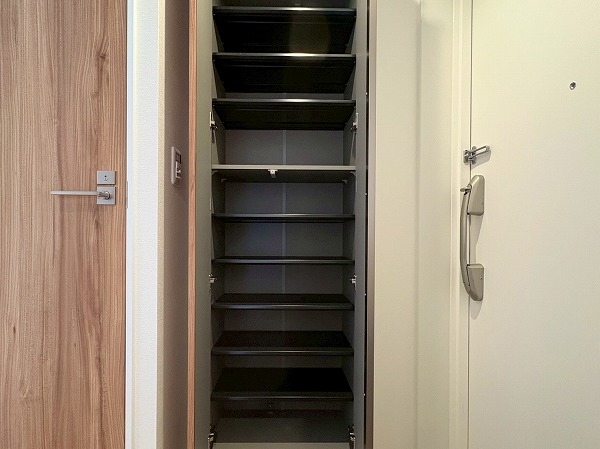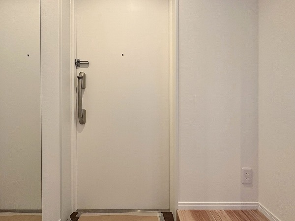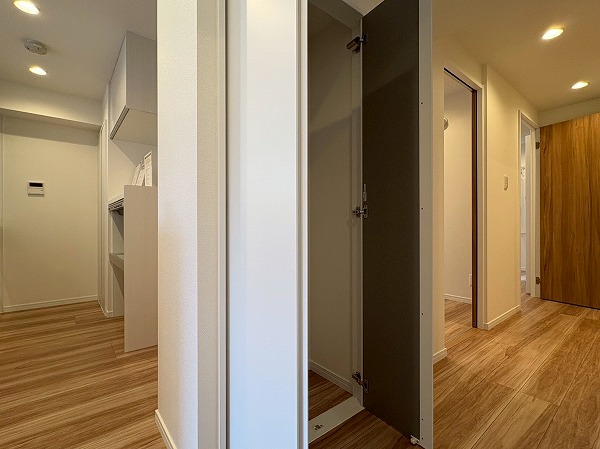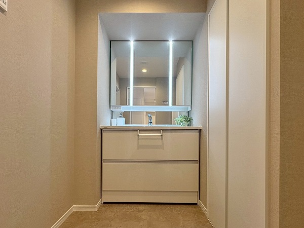 こちらが玄関です。シューズボックスに姿見がついているので、出発前の身だしなみ最終チェックはこちらでどうぞ!写真左手の扉の先には化粧室があります。外出時やお帰りの際に、玄関近くに化粧室があるのは地味にありがたいですね◎