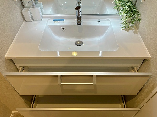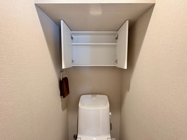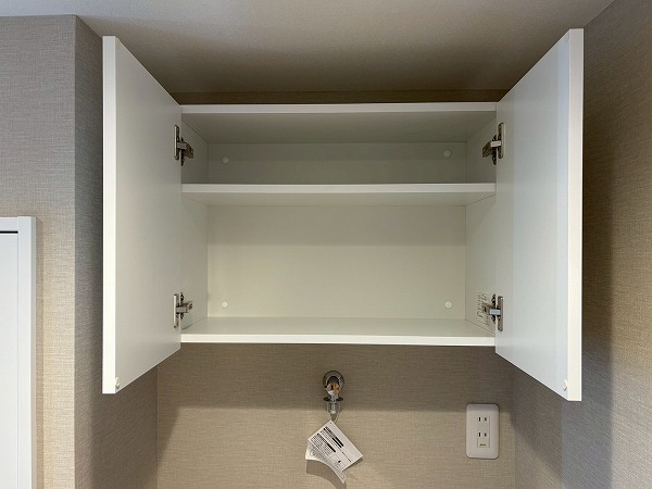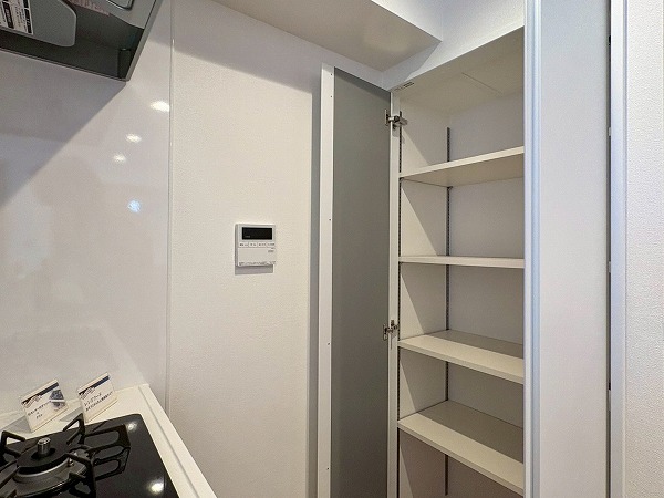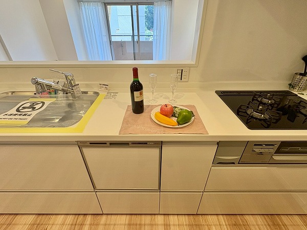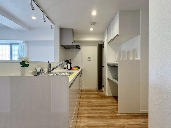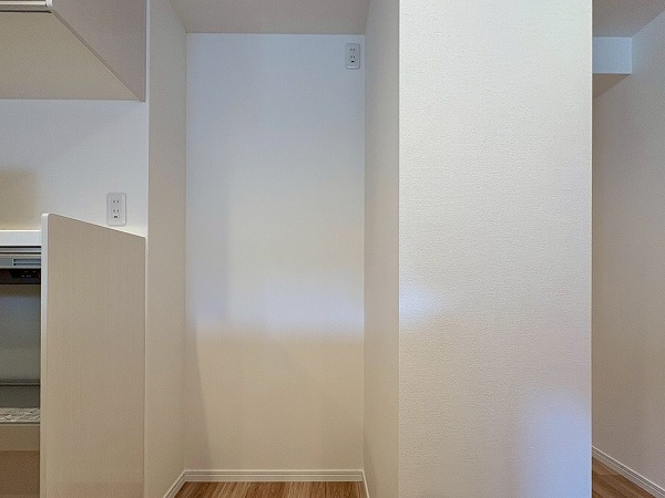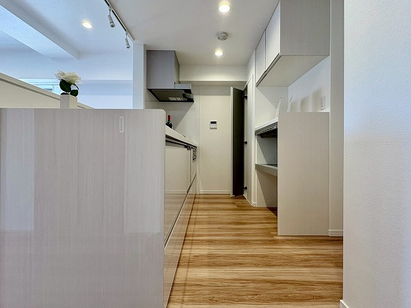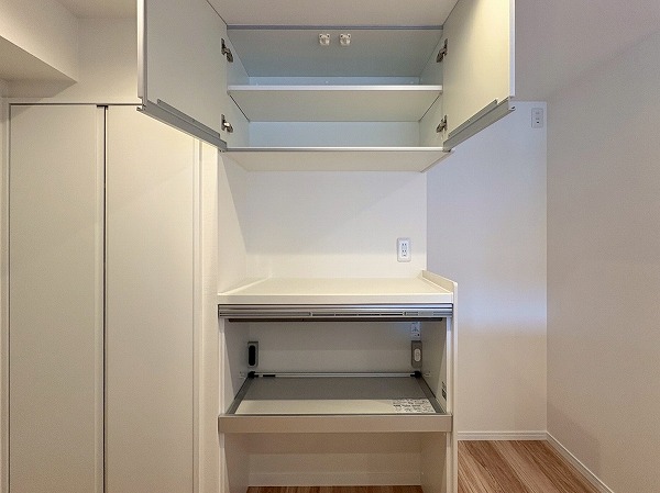 キッチンは壁が切り抜かれた、リビング・ダイニングが見える造りになっております!食器棚やキッチンストレージが常設されているので、家電を配置するだけでOK。足元は広々としていて、調理に没頭することができそうですね◎