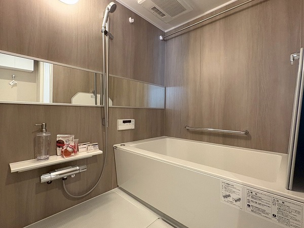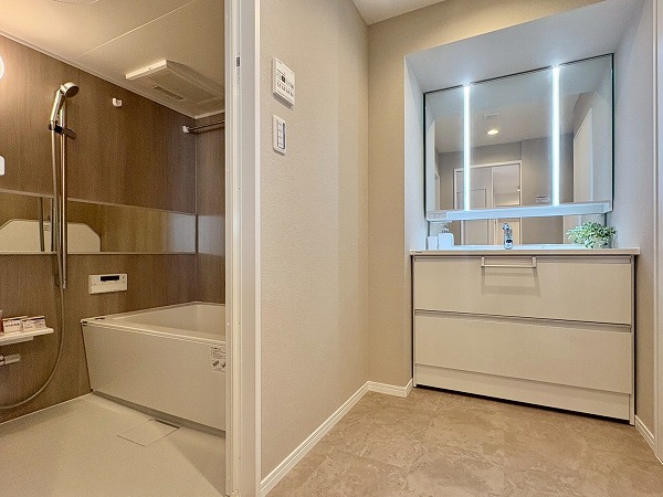 パウダールームは白~ブラウン調の落ち着いた空間です。洗面化粧台はツインラインLED照明を搭載し、毎日の身だしなみチェックもバッチリ☆ウッド調の壁がユニークなバスルームは、仕事の疲れを癒すリラックスタイムを演出します。