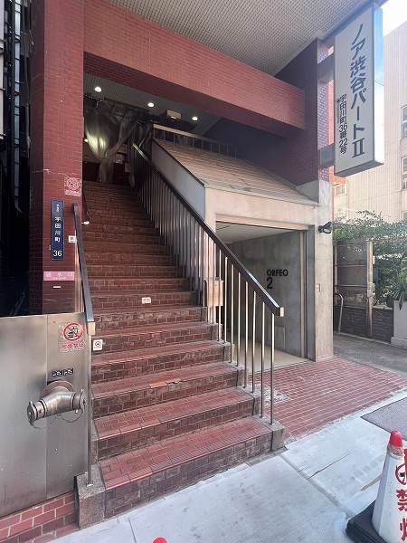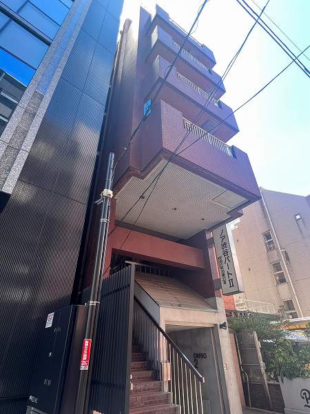 ブラウンを基調とした明るい外観の『ノア渋谷パート2』。宇田川町の閑静な住宅街に静かに佇むマンションです。階段を上ってエントランスへ向かう際は、高さがある分、雨の日は滑りやすいので足元にご注意ください。