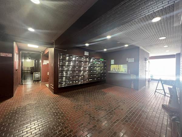 ブラウンタイルが目を引くエントランス。事務所利用のお部屋も多く、朝夕は人の出入りがちょっと賑やかですが、管理人さんと防犯カメラがしっかり見守ってくれるので安心です◎