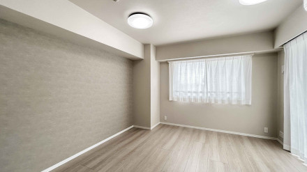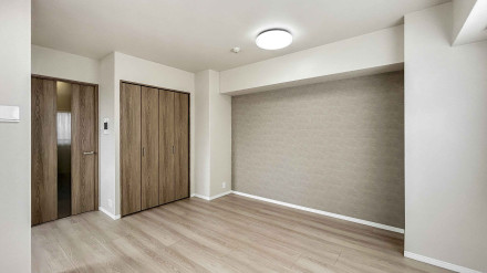 メインルームの壁面にはグレーのクロスがアクセントとして使用されています。大きなアートや壁掛けテレビが映えそうですね♪エアコンと床暖房を完備しており、オールシーズン快適に暮らせます。