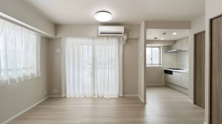 今回ご紹介するのは9階部分に位置する1K。専有面積34.87㎡で、単身での新生活におすすめなサイズ感です。2025年7月に新規リノベーションが実施され、落ち着いたナチュラルテイストに一新されました。