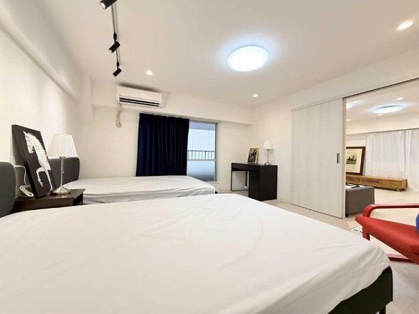 約9帖の洋室は大きなベッドを置いてもなお余裕を感じられる広さ。寝室としてのゆとりはもちろん、サイドテーブルやチェストを配置しても窮屈さを感じません。LDKとはスライドドアで仕切られており、開け放てば空間に一体感が生まれ閉じればプライベート性も確保◎