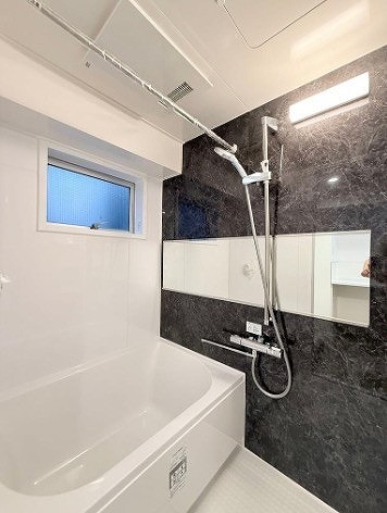 バスルームにはブラックのアクセントを施し、シックで大人びた印象に。空間を引き締めつつも、南側の小窓から自然光が入ることで、暗くなりすぎない絶妙なバランスを保っています。換気もしやすく、湿気がこもりにくいのも嬉しいポイント♩