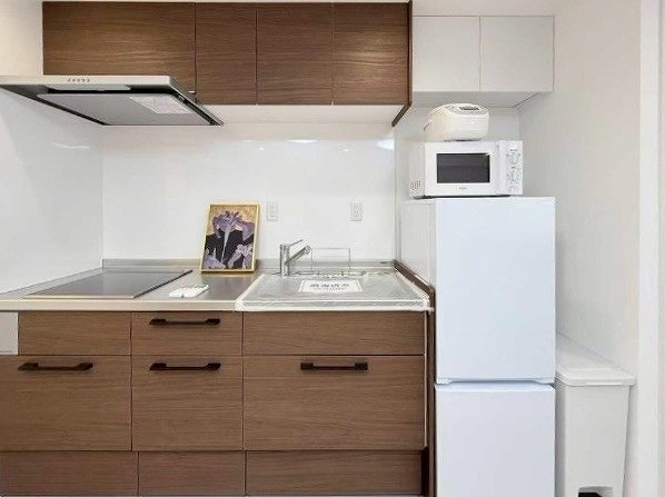 内装はホワイトでまとめ、キッチンには木目デザインを採用した壁付けタイプ。明るく軽やかな空間の中に、ほどよいアクセントとして木の質感が映えます。豊富な収納付きで生活感を抑えながら、LDKを美しく整えられるキッチン空間に仕上がっていますよ✧