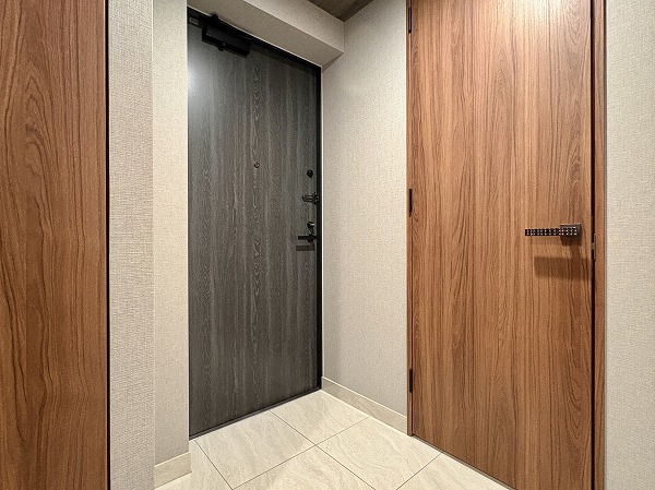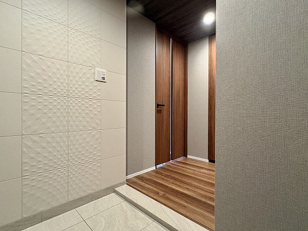 石調のタイルが用いられ、重厚感のあるアプローチ。車両置き場はエントランスの左手に設けられていました。車歩分離式なので、歩行者の方も安心してお出かけ出来ますね。エントランスにはオートロック・管理人室・防犯カメラを完備。トリプルセキュリティになっていて、防犯性の高いマンションです。