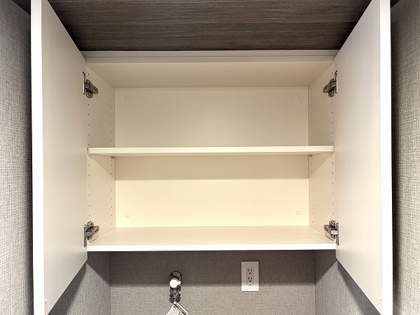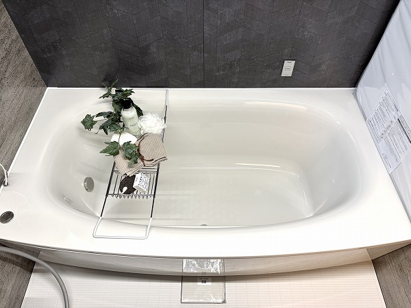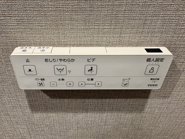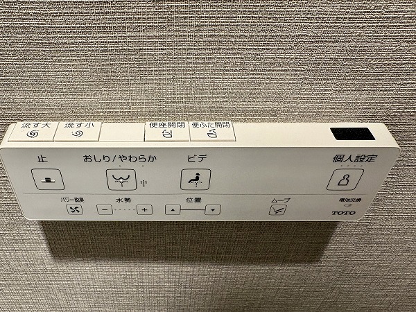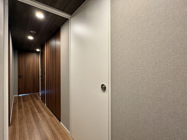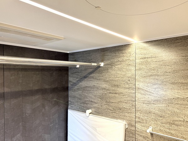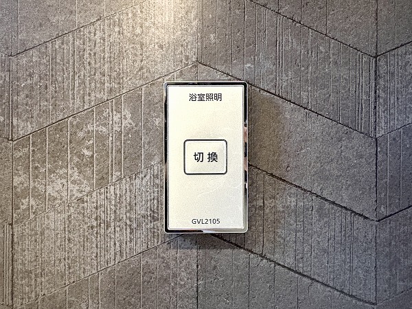 バスルームは重厚感のある石目調のクロスが印象的で、まるでホテルのようでした。照明の色を変化させる機能付きで、シーンや時間帯に合わせて色味を変えることができます。朝のシャワーは目を覚ますために白色の照明、帰宅後の入浴はリラックスできる暖色の照明など、使い分けてみましょう。