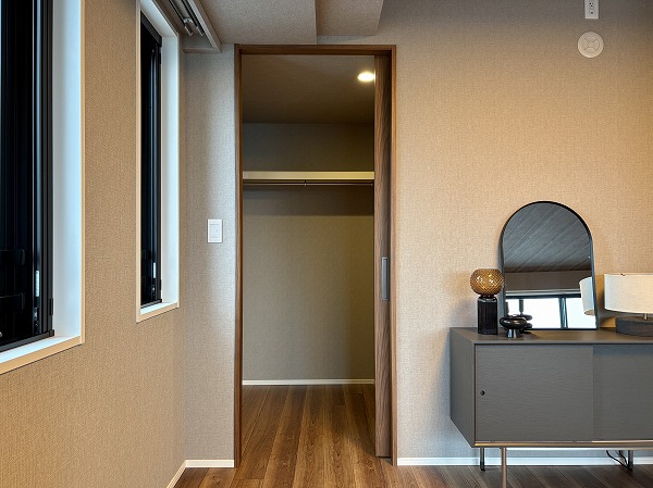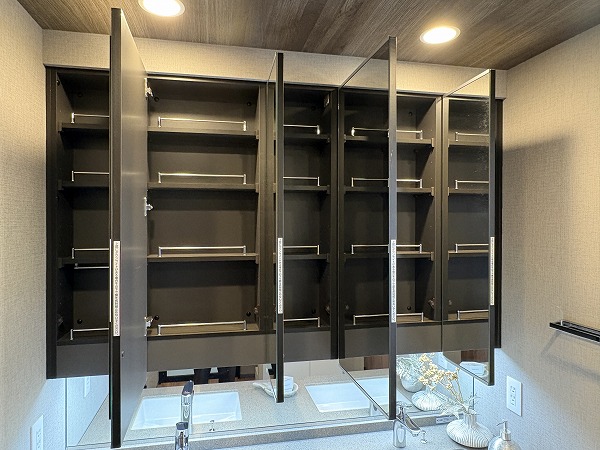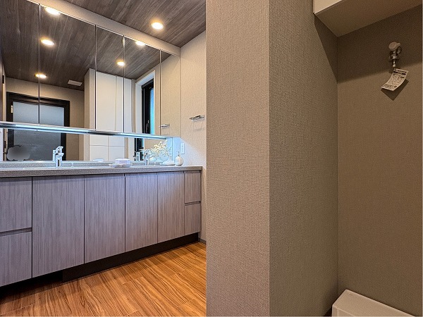 広々としたパウダールームには、大きな3面鏡化粧台がありました。ボウルが2つ付いているため、洗面所を譲り合う必要ございません。洗面台の横には窓が付いているので、湿気のこもりやすい季節には積極的に喚起しましょう◎