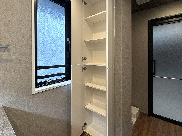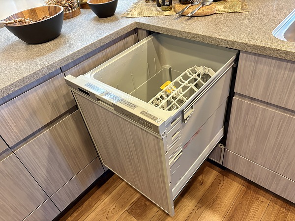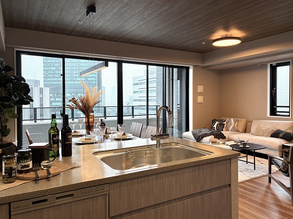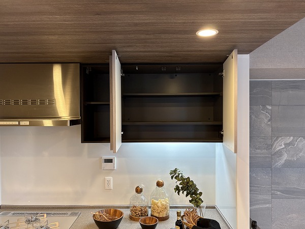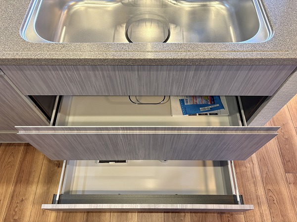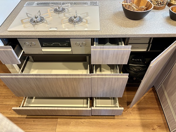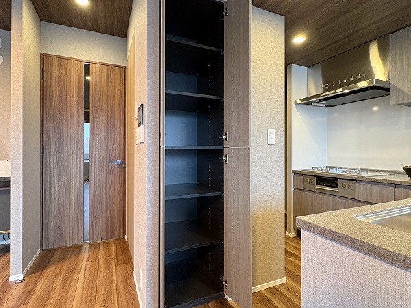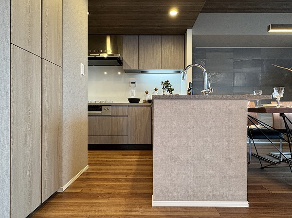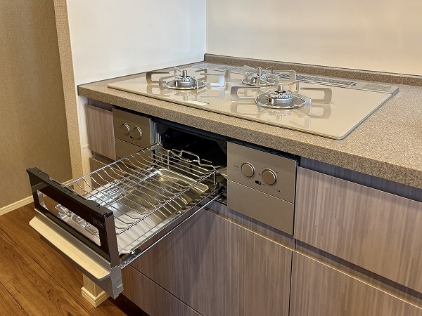 キッチンはスタイリッシュなL字型で、調理場と洗い場がそれぞれ独立した配置になっております。シンクがリビングダイニングに対面した位置にあるので、後片付けがストレスなく行えることに加え、壁に面した調理場は調理に集中するのに最適です✧