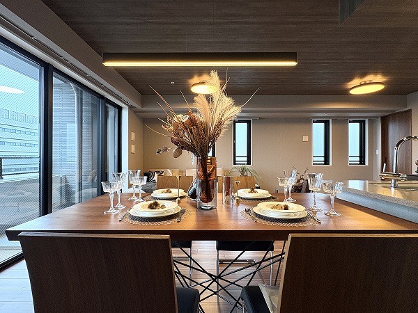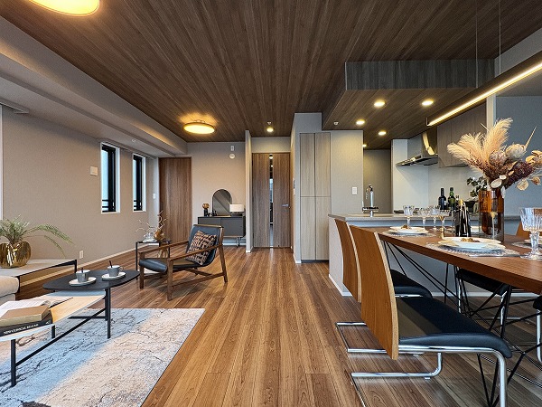 こちらがメインルーム。リビングダイニングが約20.4帖、キッチンが4.2帖の広さです。大きなダイニングテーブルや椅子、ソファを置いても余裕を残します◎フローリングと天井が同じ木目調で、優しく包み込んでくれる柔らかい色味が魅力的です✧