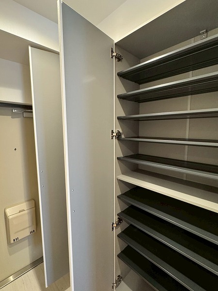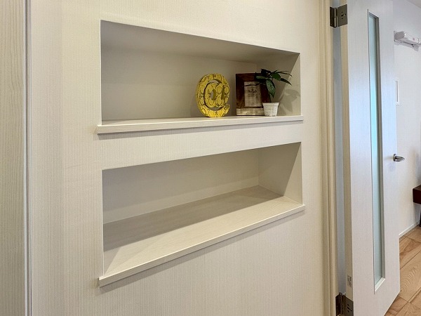 玄関前には十分な広さのシューズクローゼットが並び、靴の収納に困ることはありません◎メインルーム前のニッチ棚には、思い出の写真やコレクションを飾って空間に彩りを添えられそうです。