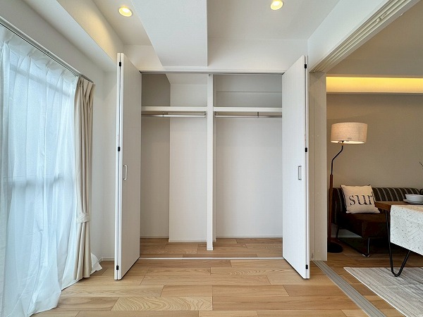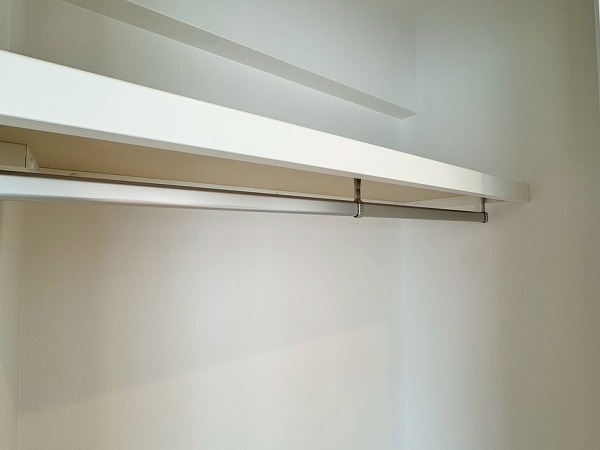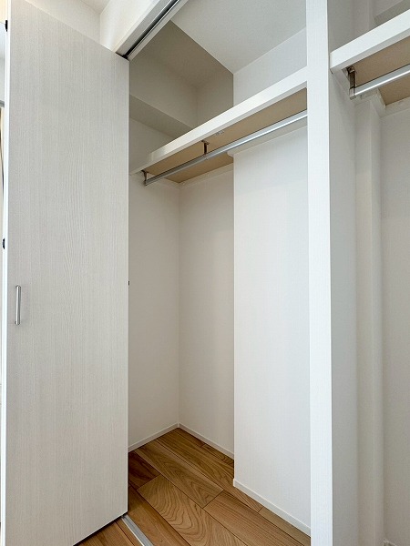 広々としたクローゼットは2つに分かれており、季節ごとやご夫婦で衣類を分けて収納可能。奥行き部分にはキャリーケースや大きな荷物も入る便利な設計です。枕棚にはバッグや帽子などの細かいものを整頓するのにぴったり◎