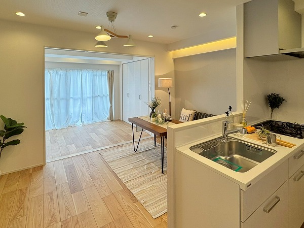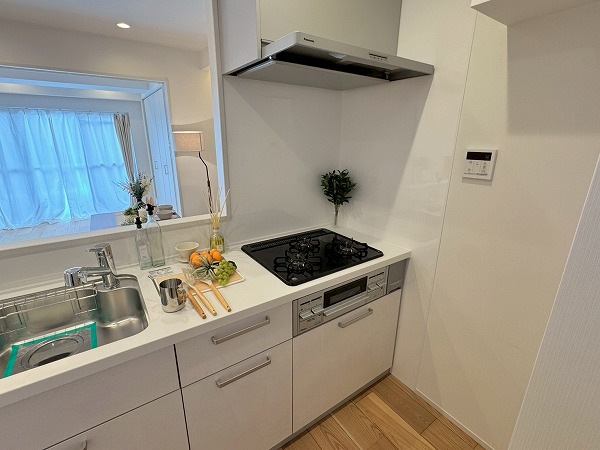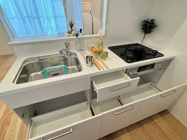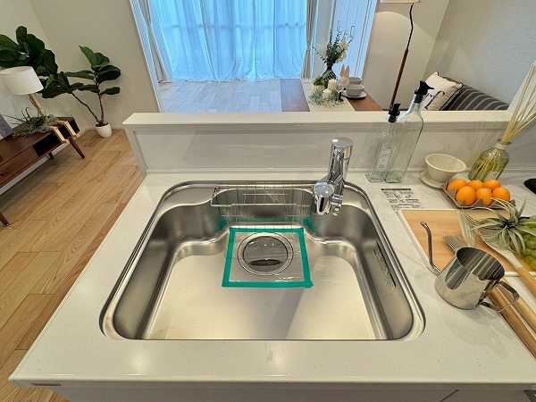 キッチンはセミオープンで、作業に集中しつつも会話を楽しめる設計。収納スペースが豊富で、浄水器付きの蛇口を搭載!毎日の水も安心して使えるのが嬉しいポイントです。