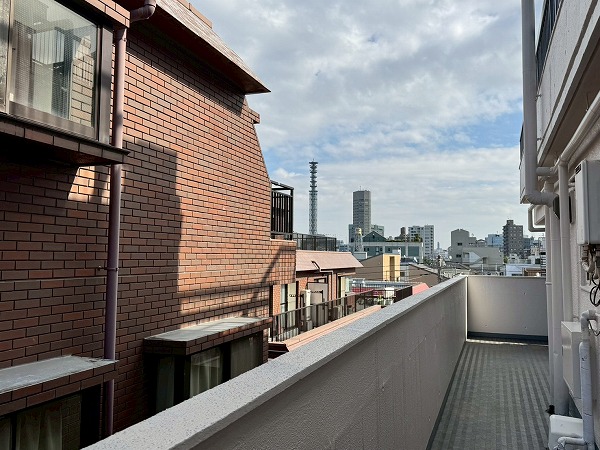 通気性の良い外廊下は、玄関を開けると爽やかな景色が広がっていました。外気温の確認もすぐにでき、気持ちよく1日をスタートできます。廊下は清掃が行き届き、落ち着いた印象です。